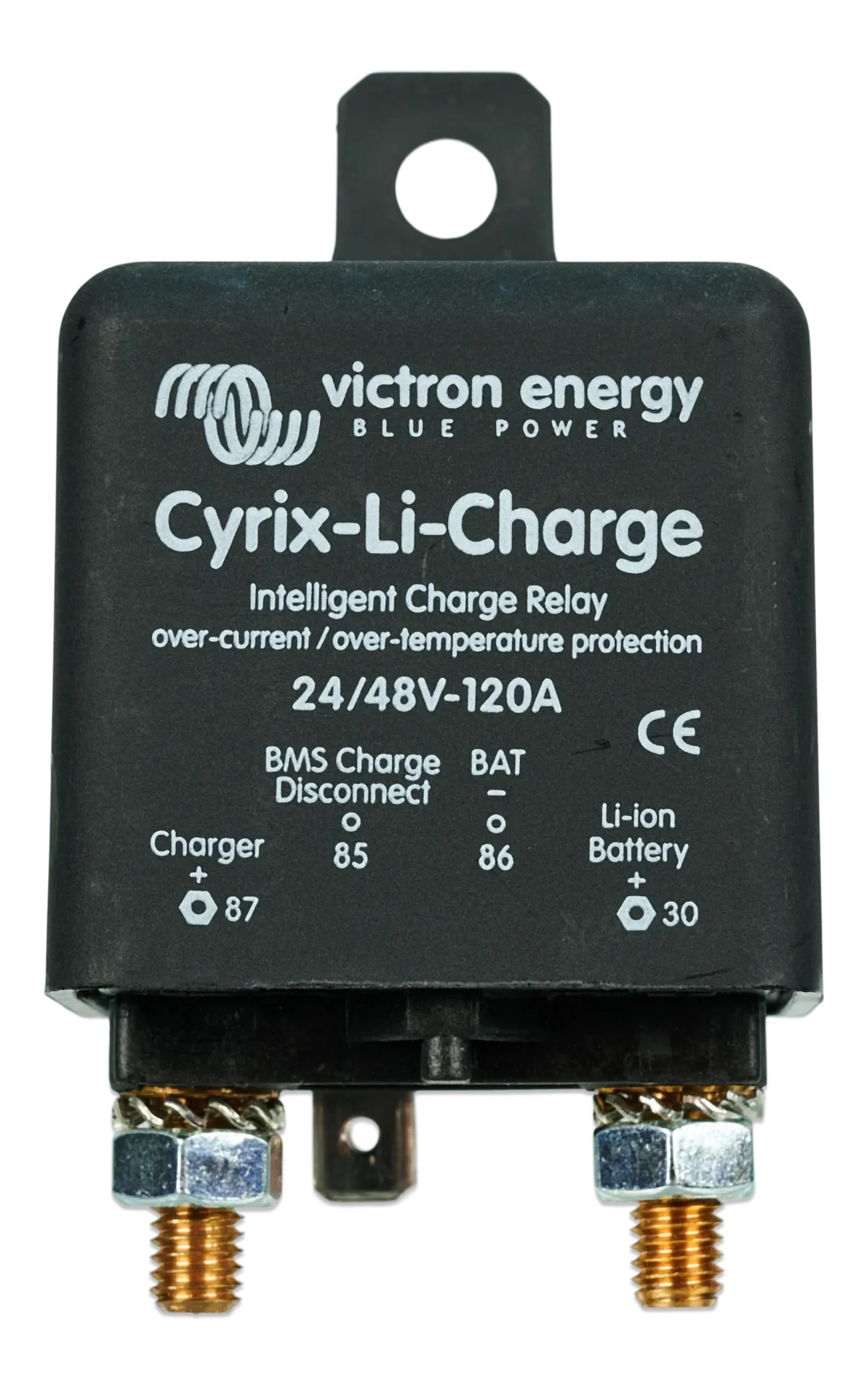 Cyrix-Li-Charge to zaawansowany, wyposażony w mikroprocesor przekaźnik stworzony przez holenderskiego producenta Victron Energy. Urządzenie odpowiada za kompleksowe sterowanie ładowarką akumulatora litowo-żelazowo-fosforanowego (LiFePO₄) działającego w systemie. W celu zapewnienia bezpieczeństwa i pełnej ochrony ogniw, sterowany jest za pomocą zewnętrznego BMS, Ve.Bus BMS lub smallBMS. Przekaźnik automatycznie łączy źródło ładowania z akumulatorem (proces ten zachodzi tylko wtedy, gdy napięcie jest odpowiednio wysokie i nie występują żadne alarmujące sygnały ze strony BMS). W przypadku wykrycia przegrzania lub przepięcia, Cyrix-Li-Charge odłącza ładowarkę, zapobiegając uszkodzeniu akumulatora. Dzięki precyzyjnemu działaniu i kompatybilności z systemami 12V oraz 24V, urządzenie stanowi niezawodny element ochrony i kontroli w nowoczesnych instalacjach zasilania.