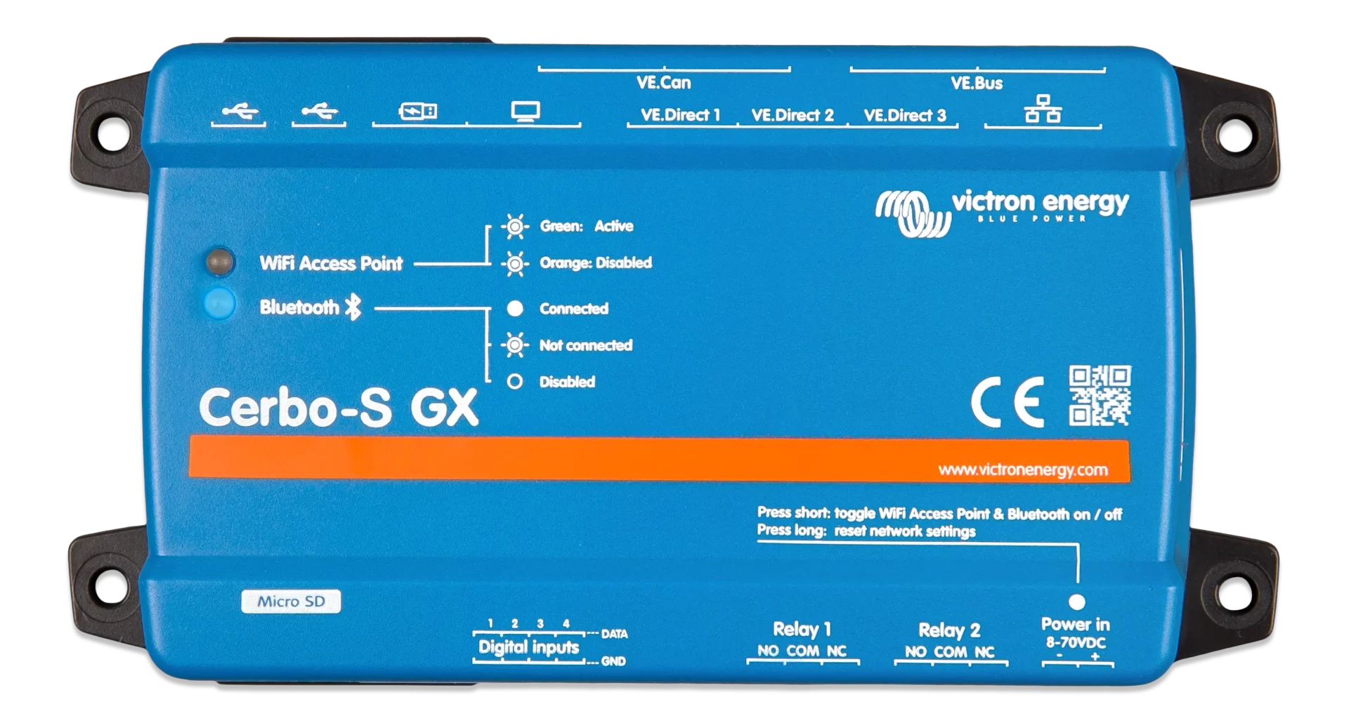 System odpowiedzialny za monitorowanie pracy komponentów Victron Energy. Cerbo w wersji S GX nie jest wyposażony w wyjścia BMS-CAN i wyjścia na czujniki poziomu cieczy. Stworzony do obsługi akumulatorów LiFePO4, żelowych i AGM.
