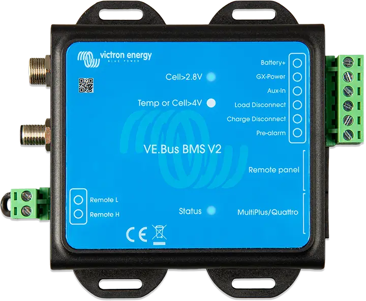 VE.Bus BMS V2 to układ zarządzania baterii, dedykowany akumulatorom litowym Victron Energy z serii Smart. Urządzenie zapewnia kompleksową ochronę ogniw w akumulatorach o napięciu 12,8 V lub 25,6 V, zabezpieczając przed zbyt niskim napięciem, wysoką temperaturą i przepięciami. W przypadku wykrycia nieprawidłowego działania baterii lub uszkodzenia ogniwa, VE.Bus BMS V2 korzysta z funkcji sygnału przedalarmowego i informuje użytkownika o potencjalnym zagrożeniu. Ponadto automatycznie odłącza inne komponenty działające w systemie (ładowarki, falowniki), tak, aby nie doprowadzić do ich uszkodzenia. Zastosowanie układu zarządzania przekłada się na długą żywotność urządzeń funkcjonujących w systemach energetycznych różnego rodzaju, zarówno stacjonarnych, jak i mobilnych.